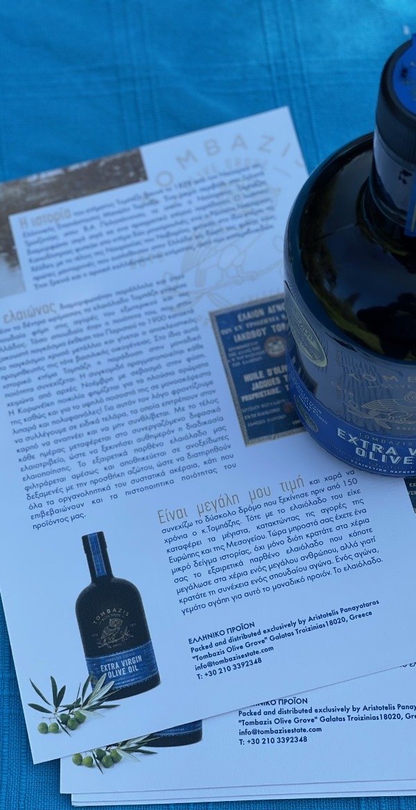 Είναι μεγάλη μου τιμή και χαρά να συνεχίζω τον δύσκολο δρόμο που ξεκίνησε πριν πάνω από 150 χρόνια ο I. Τομπάζης. Τότε με το ελαιόλαδο του είχε καταφέρει τα μέγιστα κατακτώντας τις αγορές της Ευρώπης και Μεσογείου. Τώρα μπροστά σας έχετε ένα μικρό δείγμα ιστορίας, όχι μόνο γιατί κρατάτε στα χέρια σας το εξαιρετικό παρθένο ελαιόλαδο που κάποτε μεγάλωσε στα χέρια ενός μεγάλου ανθρώπου, αλλά γιατί κρατάτε την συνέχεια ενός σπουδαίου αγώνα. Του αγώνα και της αγάπης για αυτό το μοναδικό προϊόν όπως είναι το Ελαιόλαδο.